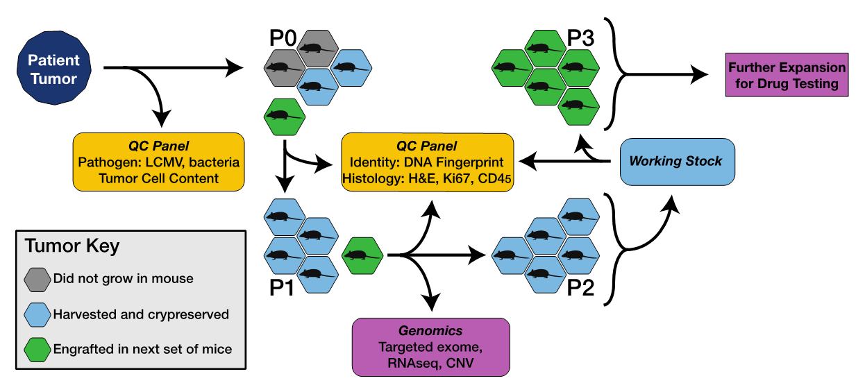 Figure 1. Process for developing PDX models, including pathogen testing, genomic characterization and quality control (QC).